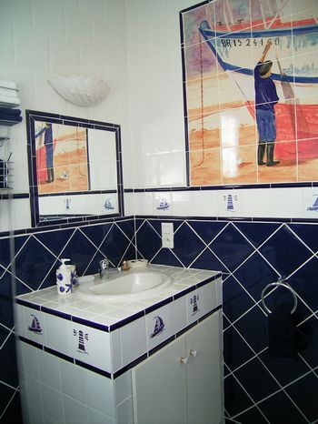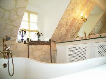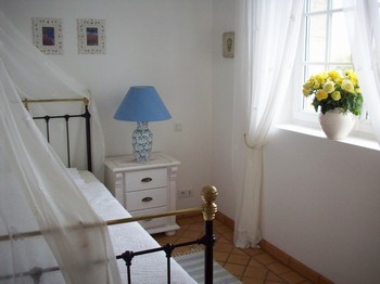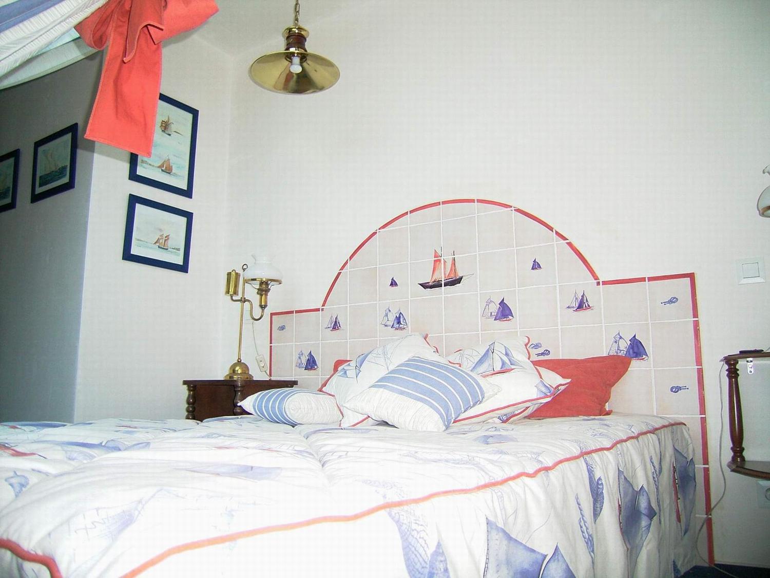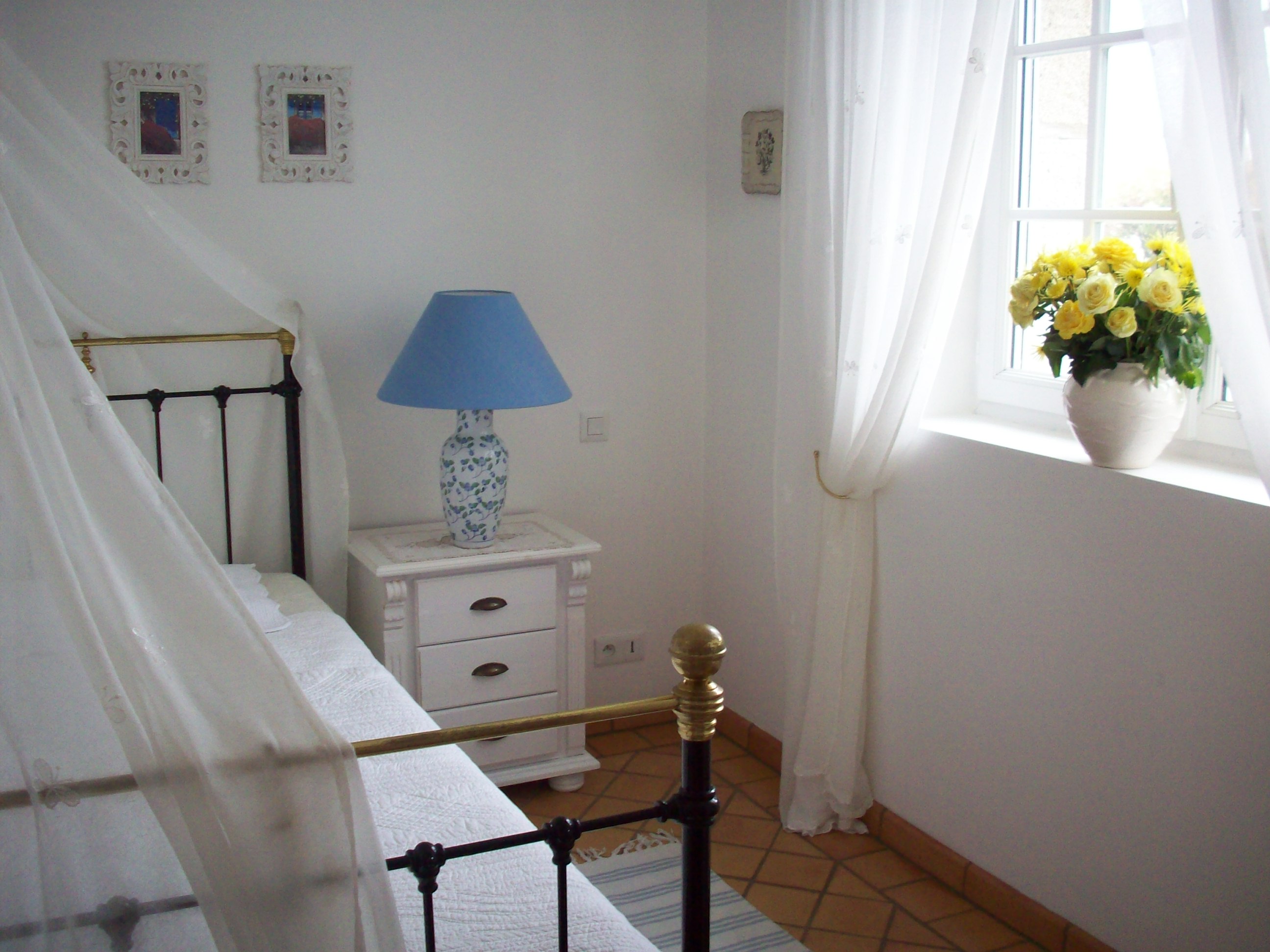 "Meerzimmer": Rustikal eingerichtetes Zimmer mit Doppelbett (Liegefläche 1,60x2,00m) und eigenem kleinen Badezimmer (Waschbecken und Bidet). Vom Bett aus herrlicher Blick aufs Meer durch das große Rundbogenfenster sowie Blick auf den See. SAT HD TV