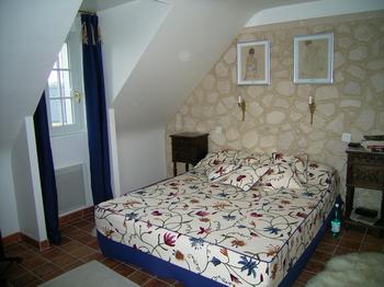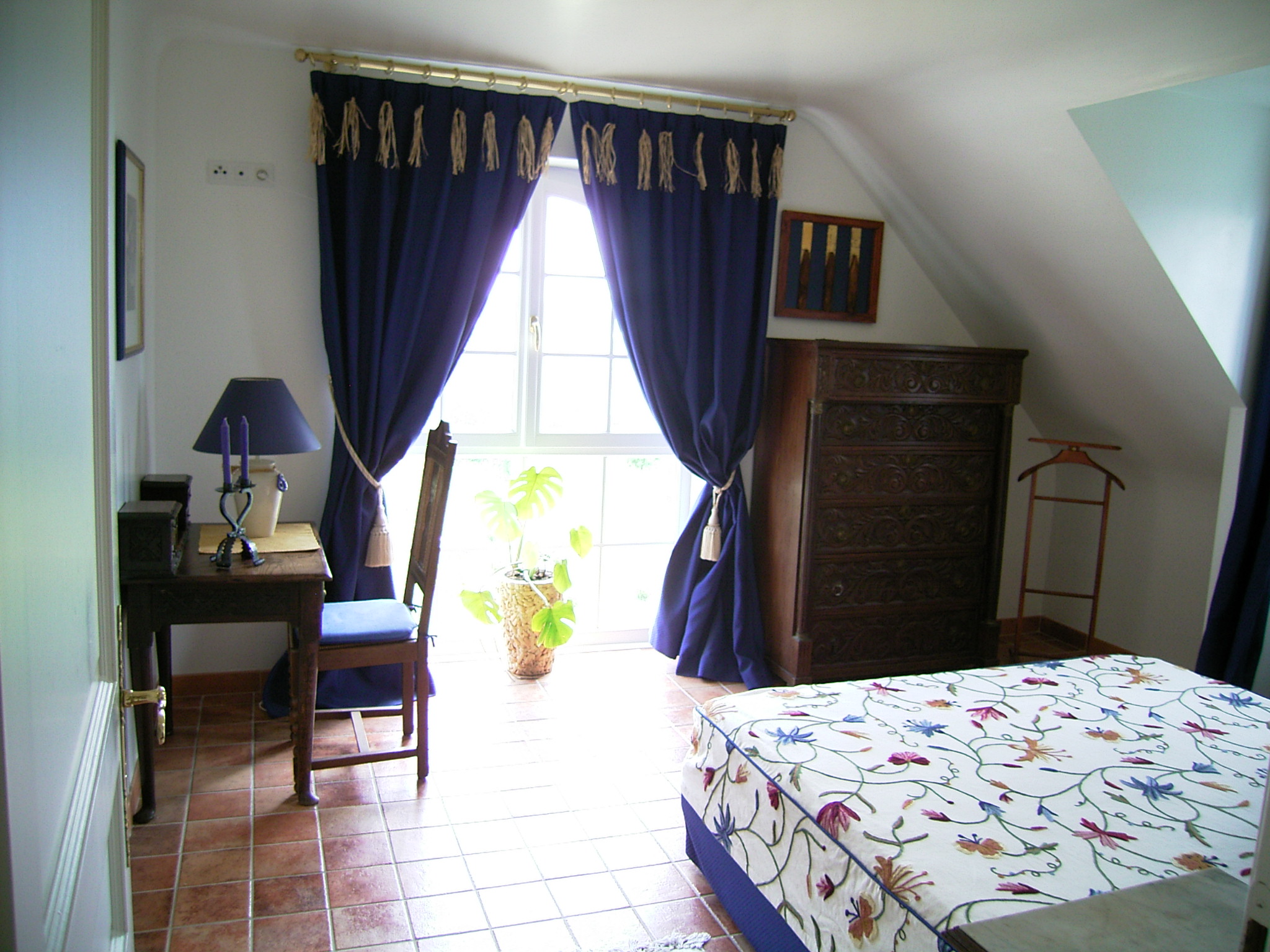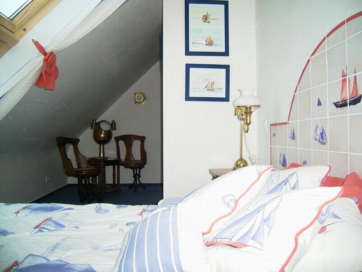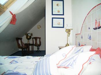 "Sternenzimmer": Maritim eingerichtetes Zimmer mit Doppelbett (1,40x2,00m). Vom Bett aus Blick auf den See und durch das große Velux-Fenster Sicht auf den atemberaubenden Sternenhimmel der Bretagne!