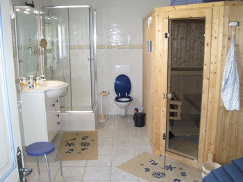 Badezimmer mit Dusche und Sauna (2,50m x 2,00m), heisses Wasser ohne Mengenbegrenzung durch elektronischem Durchlauferhitzer