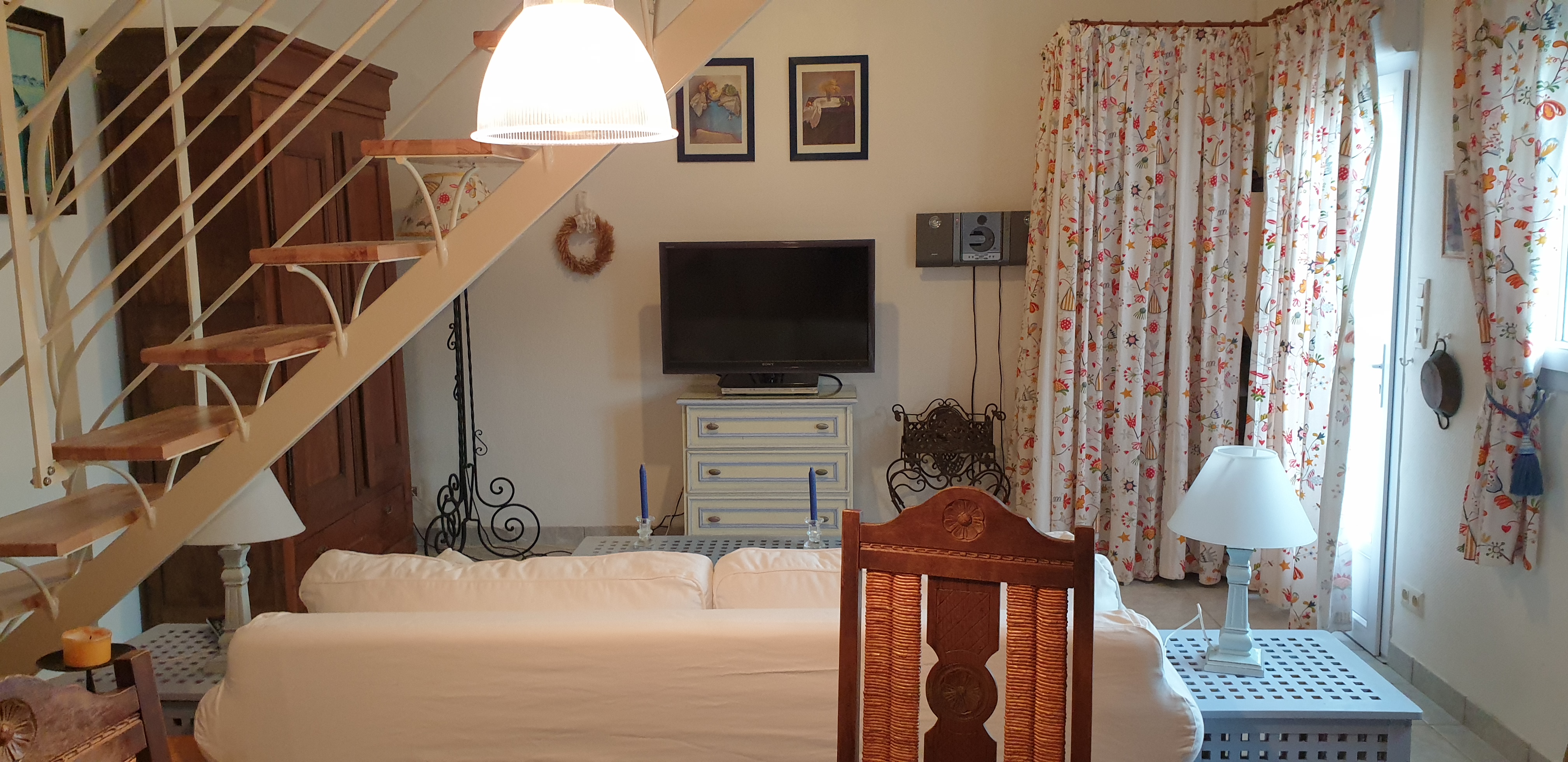 zur Verfügung. Das Doppelbett ist im Wohnraum in einem Mezzanine untergebracht,