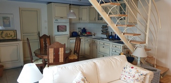 aus einem Wohnraum mit Küche, Esstisch und Wohnbereich und einem Bad