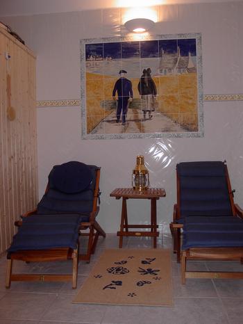 mit Dusche, Toilette, Sauna und Liegebereich.
